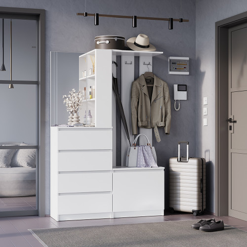Прихожая «Симпл» (ПР-04) — конструкция продумана до мелочей. Комплект оснащен всем необходимым для комфортного размещения вещей в прихожей. Впишется как в просторное, так и в небольшое помещение. Под зеркалом в минималистичном дизайне — четыре выдвижных ящика, в которых можно хранить шарфы, шапки и другие нужные аксессуары. Еще одна нижняя полка подойдет для хранения сезонной обуви, а три открытых полки рядом с зеркалом — для ключей. Несколько крепких крючков для верхней одежды. Нижняя откидная створка - на кронштейнах.