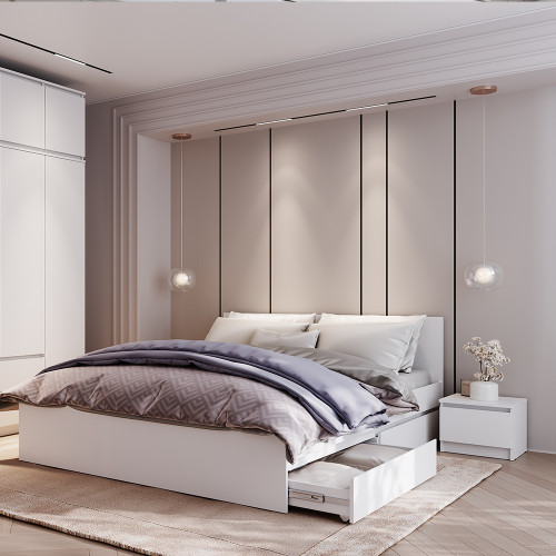 Основание для кровати приобретается отдельно, на выбор: настил ЛДСП с кромкой, реечный настил. Кровать оснащена выкатными ящиками, в которых легко размещается постельное белье, текстиль и другие вещи, которым не нашлось места в шкафу.
