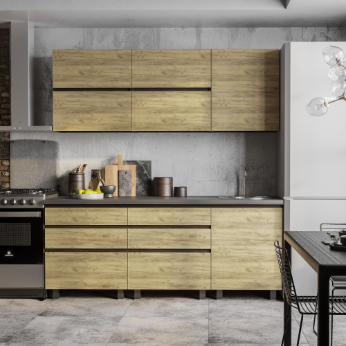 Геометричные формы этой модели сопровождает минимальное число деталей. Стиль "минимализм" воплощает в себе самые современные тенденции в дизайне кухонь. В жертву им принесены ручки фасадов - ничто не должно нарушать эту строгую идиллию. Каркас и ящики в цвете "венге", встроенный профиль, аксессуары - все элементы кухни дополняют друг друга, складываясь в единую композицию. Гармония тёмных оттенков также подчеркивает стиль "минимализм". Разнообразие текстур, фактур и декоров позволяет воплощать в жизнь самые смелые дизайнерские решения.