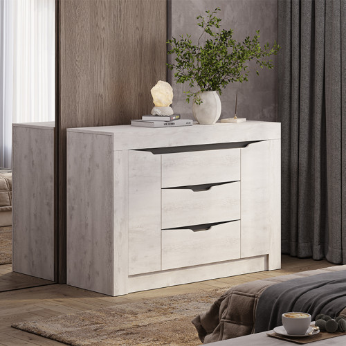 Минималистичный комод «Леонардо» - вместительная и эстетичная модель для гостиной или спальни. Комод состоит из трёх выдвижных ящиков и двух вертикальных отсеков для хранения, которые открываются с помощью эргономичных выемок. Модель идеально подходит для хранения документов, одежды, важных мелочей. Крышка тумбы может использоваться для предметов декора, книг и светильников.