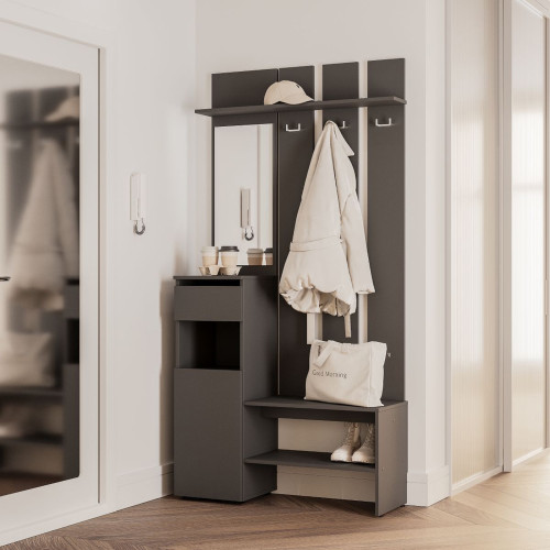 Прихожая «Мия» представлена в двух трендовых оттенках, которые дополнят прихожую в нейтральных тонах или подчеркнут пространство с яркими акцентами в интерьере. Простая геометрическая конструкция без лицевой фурнитуры создаст атмосферу лёгкости и визуально расширит прихожую. Для комфортной подготовки к выходу из дома модель дополнена вертикальным зеркалом.