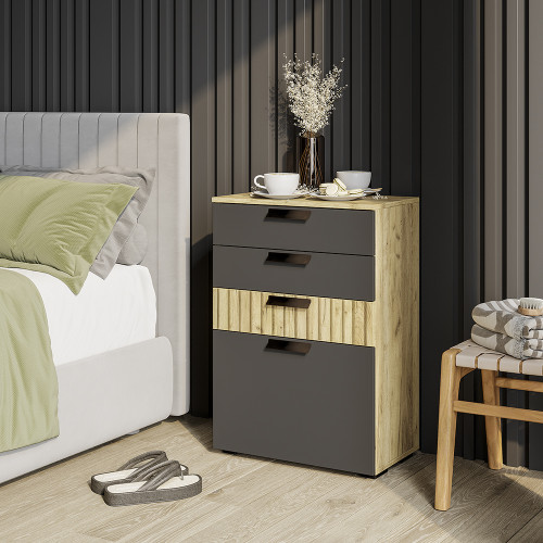 Гостиная "Мишель" - это модель с универсальной конструкцией для современного дома. Фасады в глубоком оттенке "графит" будут отлично контрастировать со стенами в нейтральных или насыщенных холодных тонах. Корпус и поверхности, выполненные в цвете "крафт", хорошо гармонируют с фотопечатью, имитирующей деревянные рейки.