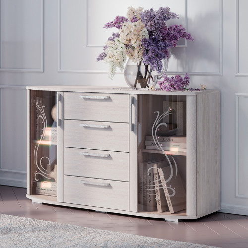 Комод «Флорида» - современный стильный комод, который займёт достойное место как в спальной комнате, так и в гостиной Вашего дома. Фасад модели представляет собой прекрасный тандем стеклянных и деревянных элементов. Светлый цвет корпуса и фасада в комбинации с прозрачными стеклостворками делают модель лёгкой, визуально увеличивая пространство комнаты. Вместительные глубокие ящики на роликовых направляющих обеспечивают легкую, бесшумную и долговечную эксплуатацию моделей. На просторной столешнице комода можно разместить телевизор, элементы декора или домашние растения.