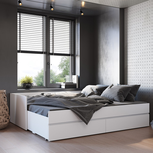 Кровать-трансформер из коллекции "Симпл" - это практичная и комфортная модель для современной спальни. Простой и стильный дизайн покорит ценителей минимализма. Данная модель удобна в использовании в небольших помещениях - при необходимости ее можно раздвинуть и получить дополнительное спальное место. Кровать оснащена выкатными ящиками, в которых легко размещается постельное белье, текстиль и другие вещи, которым не нашлось места в шкафу. Спальное место: 924*2000, в разложенном виде: 1800*2000. Основание для кровати в комплекте - ламели для раздвижных кроватей.